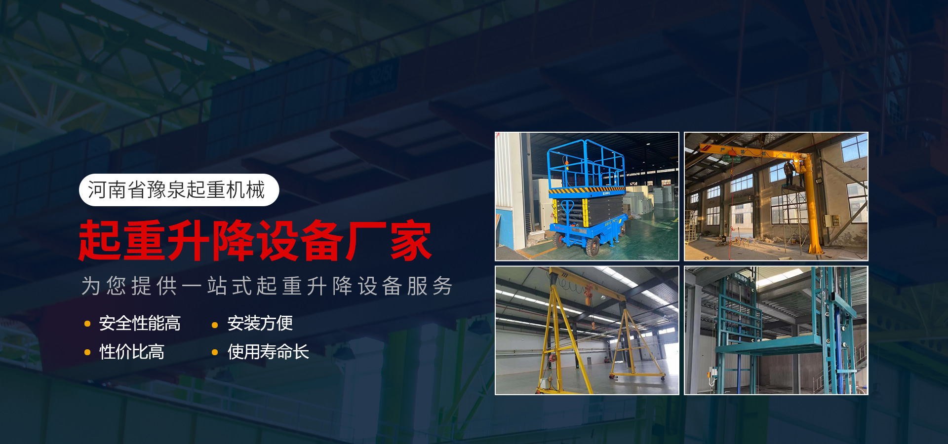 河南省豫泉起重機械有限公司位于河南省新鄉市長垣,我公司主要銷售各種型號單、雙梁、橋式、門式起重機、龍門吊、無軌龍門吊、懸臂吊、液壓貨梯、升降平臺、起重吊具、卷揚機、電磁吸盤及零部件的制造及銷售等。  廣泛應用于水泥、礦山、鋼鐵、冶金、煤礦、建筑及物流等行業。河南省豫泉起重機械有限公司根據市場發展的需要在進一步完善定型產品的基礎上,不斷開發出新產品和引進高新生產技術。  精誠合作,互利雙贏是我們...【查看詳情+】